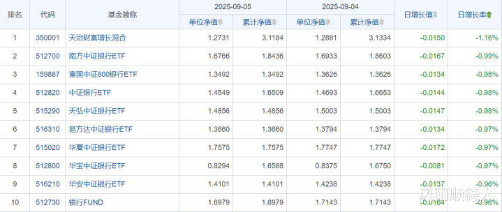 5日开放式基金净值增长排名后10的基金分别是:天治财富增长混合、南方中证银行ETF、富国中证800银行ETF、汇添富中证银行ETF、天弘中证银行ETF、易方达中证银行ETF、华夏中证银行ETF、华宝中证银行ETF、华安中证银行ETF、鹏华中证银行ETF。