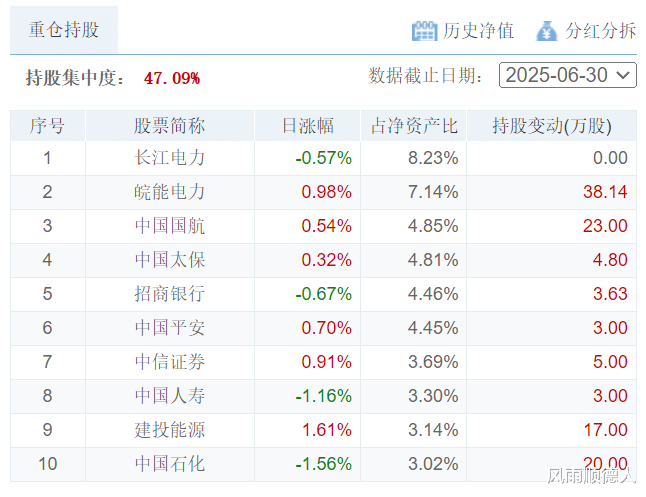 该基金十大持仓中没有出现跌幅较大的个股,前十持仓占总持仓的47.09%,不过持仓都是高股息红利风格,今天银行、、电信运营等板块跌幅相对较大,还是有可能出现这种回辙的。基金风格属于高股息红利概念,基金净值相对跑输市场(属于高股息红利的主动型混合基金)【基金规模0.37亿元】。