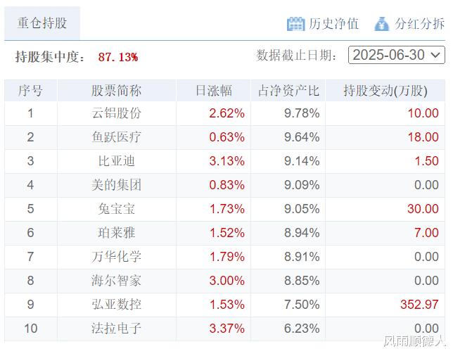 该基金前十大持仓中比亚迪、海尔智家、法拉电子涨幅较大,前十持仓占总持仓的87.13%,很明显这种持仓是不太可能有13.01%的净值增长,指数基金方面清一色固态电池风格,而且今天能涨过固态电池的基本没有,可以明确基金风格已调整但方向未明(其实就是刚刚调仓至最强板块,但基金没公告就只能说疑似),基金净值相对跑赢市场(属于一般的主动型混合基金,且基金经理已调仓) 【基金规模5.89亿元】。净值增长较差的是天治财富增长混合,