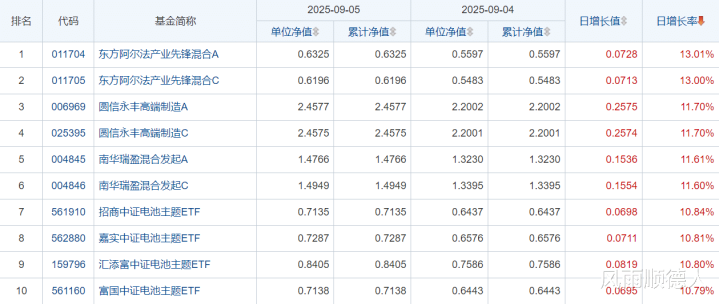 5日开放式基金净值增长排名前10的基金分别是:东方阿尔法产业先锋混合A、东方阿尔法产业先锋混合C、圆信永丰高端制造A、圆信永丰高端制造C、南华瑞盈混合发起A、南华瑞盈混合发起C、招商中证电池主题ETF、嘉实中证电池主题ETF、汇添富中证电池主题ETF、富国中证电池主题ETF策略红。